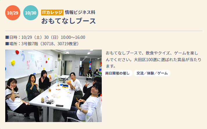 1年生はおもてなしブースを3号館30718、30719教室にて開催します